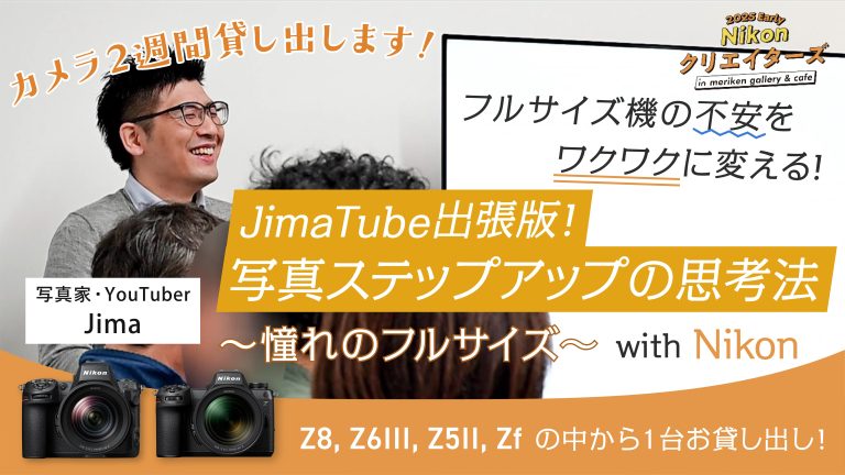 このたび、神戸のメリケンギャラリーでは、「Nikon クリエイターズ in meriken gallery & … 続きを読む 〜カメラ2週間貸し出し〜フルサイズ機の不安をワクワクに変える! JimaTube出張版!写真ステップアップの思考法 ~憧れのフルサイズ~ with Nikon